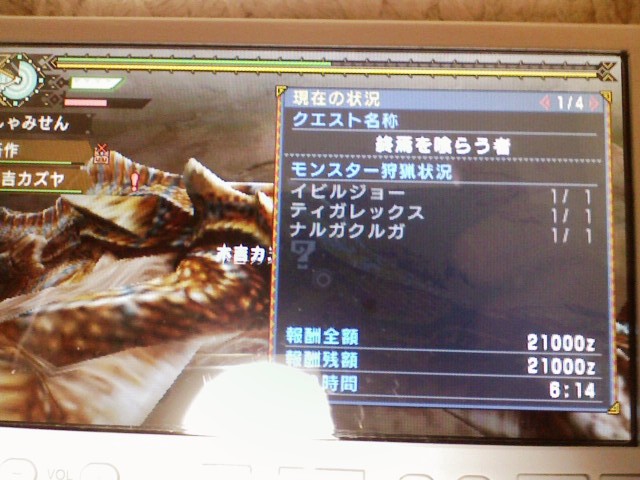 ガキ使も観終わったし、2011年になったもんだから、初狩猟に以前3乙の憂き目にあった村最終にリベンジしてみようかなぁ、と行ってみたら普通にクリアー。